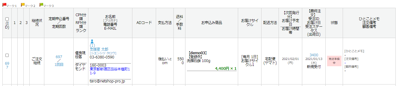 受注管理>定期お申込み一覧より、定期商品購入のお申込み一覧が確認できます。