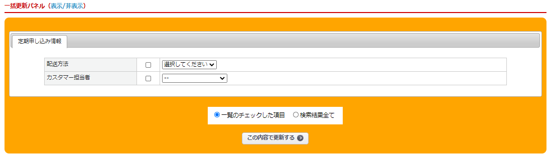 一括更新パネルから”配送方法”と”カスタマー担当者”の一括更新が可能です。
