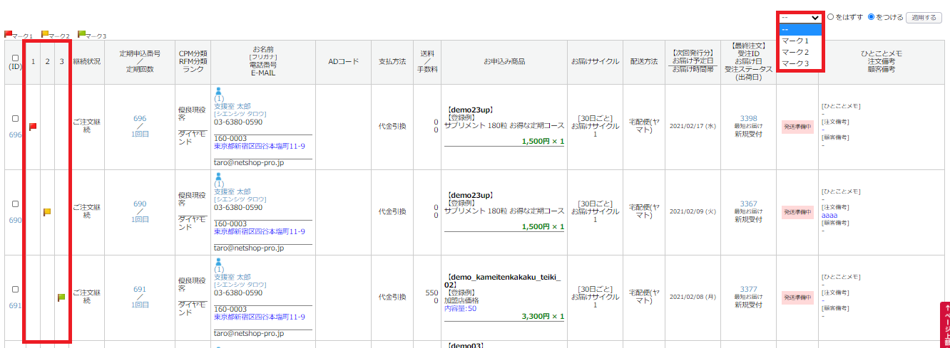 絞り込みパネルからマークがついた定期お申込み情報の検索が可能です。