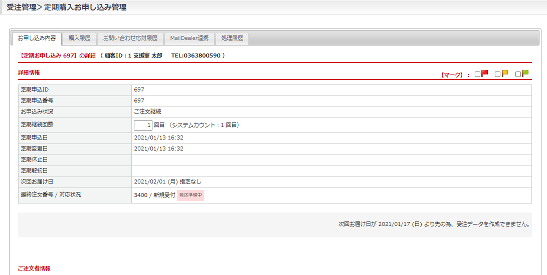 | ご注文継続 | 定期申し込みが有効な状態です。 次回お届け日をもとに自動的に定期継続受注データが発行されます。 |