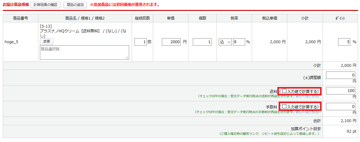 定期お申込み情報のお届け商品情報で送料、手数料の「入力値で計算する」にチェックが