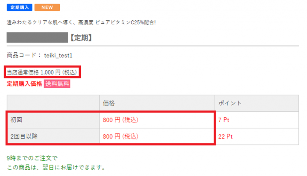 (例)表示価格:1,000円 定期初回販売価格、販売価格:800円(20%オフ)