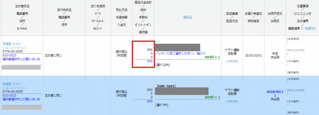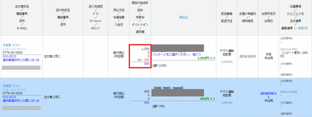受注詳細は以下のように表示されます ※赤枠が定期2回目の表示