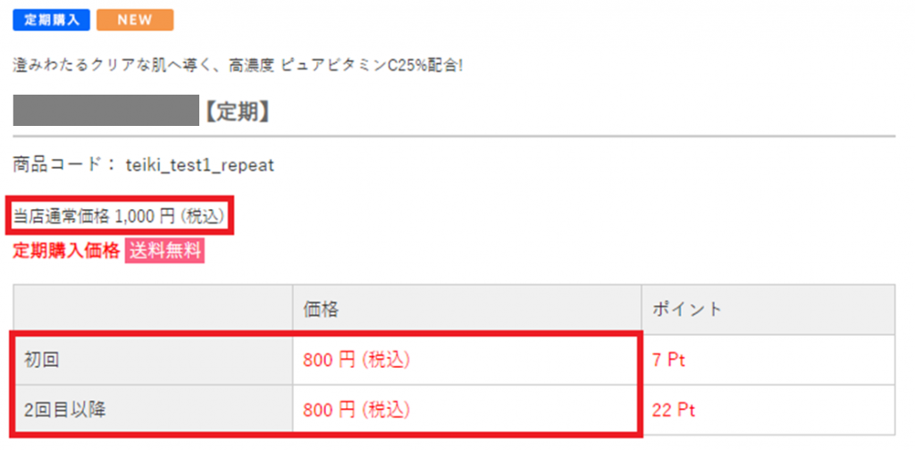 (例)表示価格、販売価格:1,000円 定期初回販売価格:800円(20%オフ) リピート割引率:20%引き