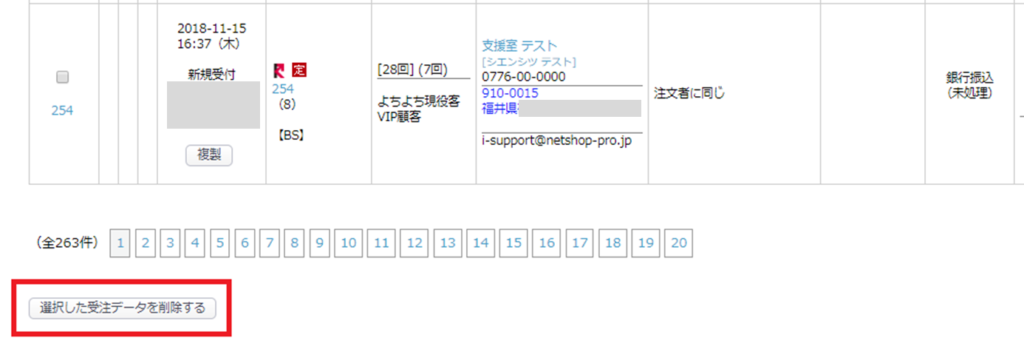 受注管理>受注一覧の下部にある「選択した受注データを削除する」ボタンから削除が可能です。