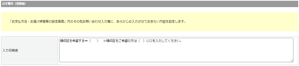 - 基本設定>カートシステム設定>「カート・決済機能設定」タブ:注文備考(初期値)