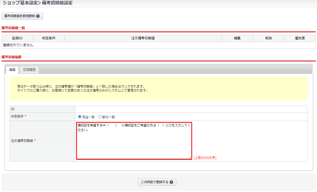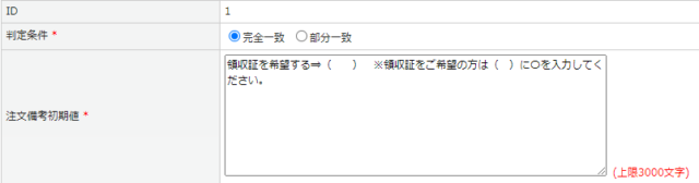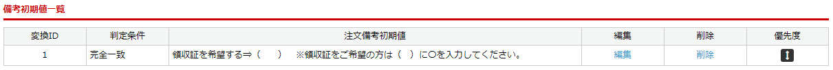 注文備考の初期値に関する設定です。