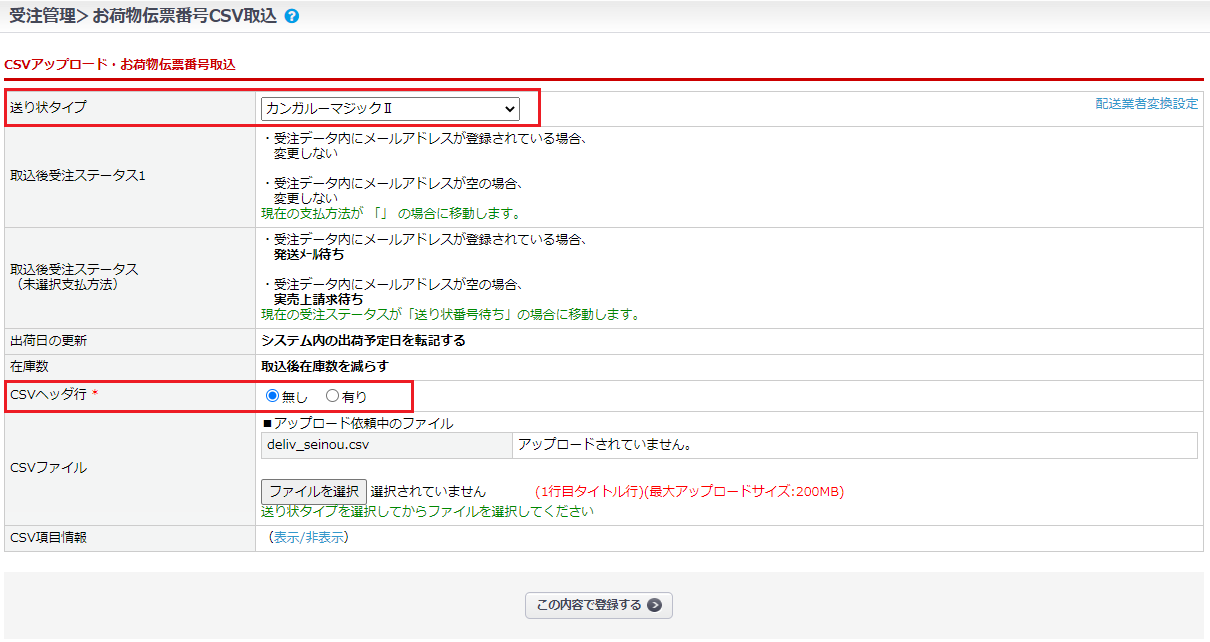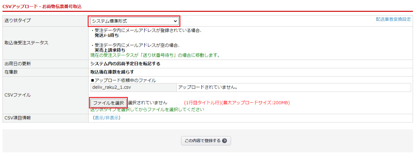送り状タイプを選択後、【ファイルを選択】ボタンをクリックし、【この内容で登録する】ボタンをクリックしてアップロードしてください。