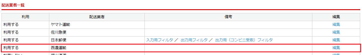 ※基本設定>配送業者設定 の「西濃運輸」を「利用する」と設定した場合に