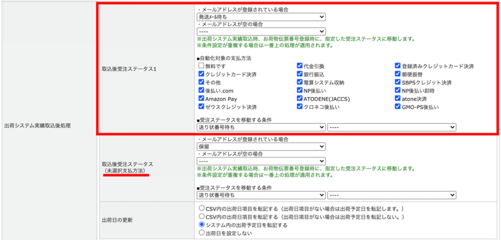 出荷システムで支払方法別に取込後受注ステータスを分ける場合