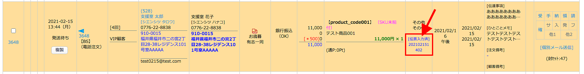 お荷物伝票番号CSV取込を行うと、受注データの伝票番号欄に伝票番号が表示されます。