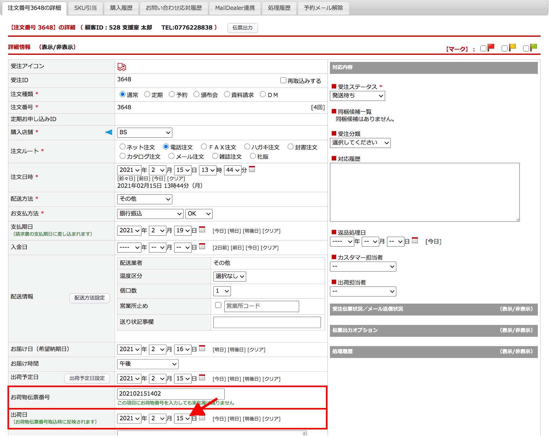 受注詳細画面では「お荷物伝票番号」欄に伝票番号が表示され、「出荷日」欄の日付が更新されます。