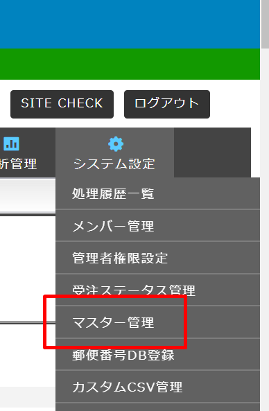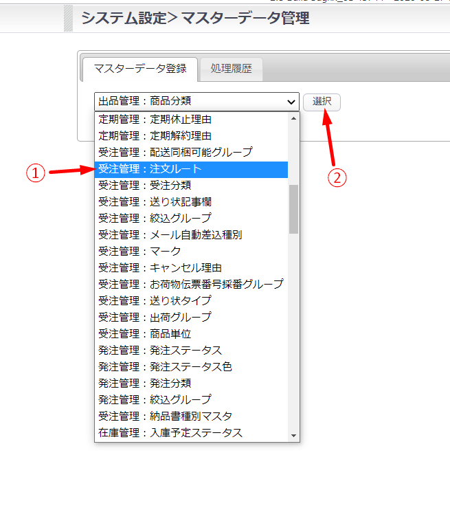 マスター管理ページのプルダウンより「受注管理:注文ルート」を選び、「選択」ボタンを押下してください。