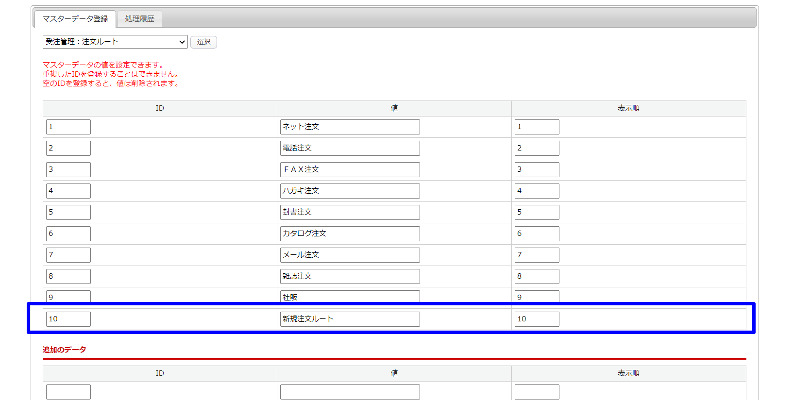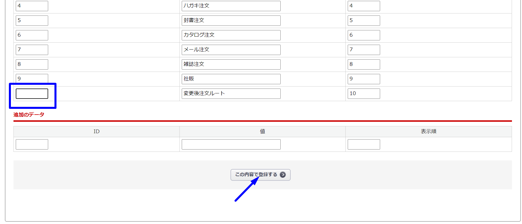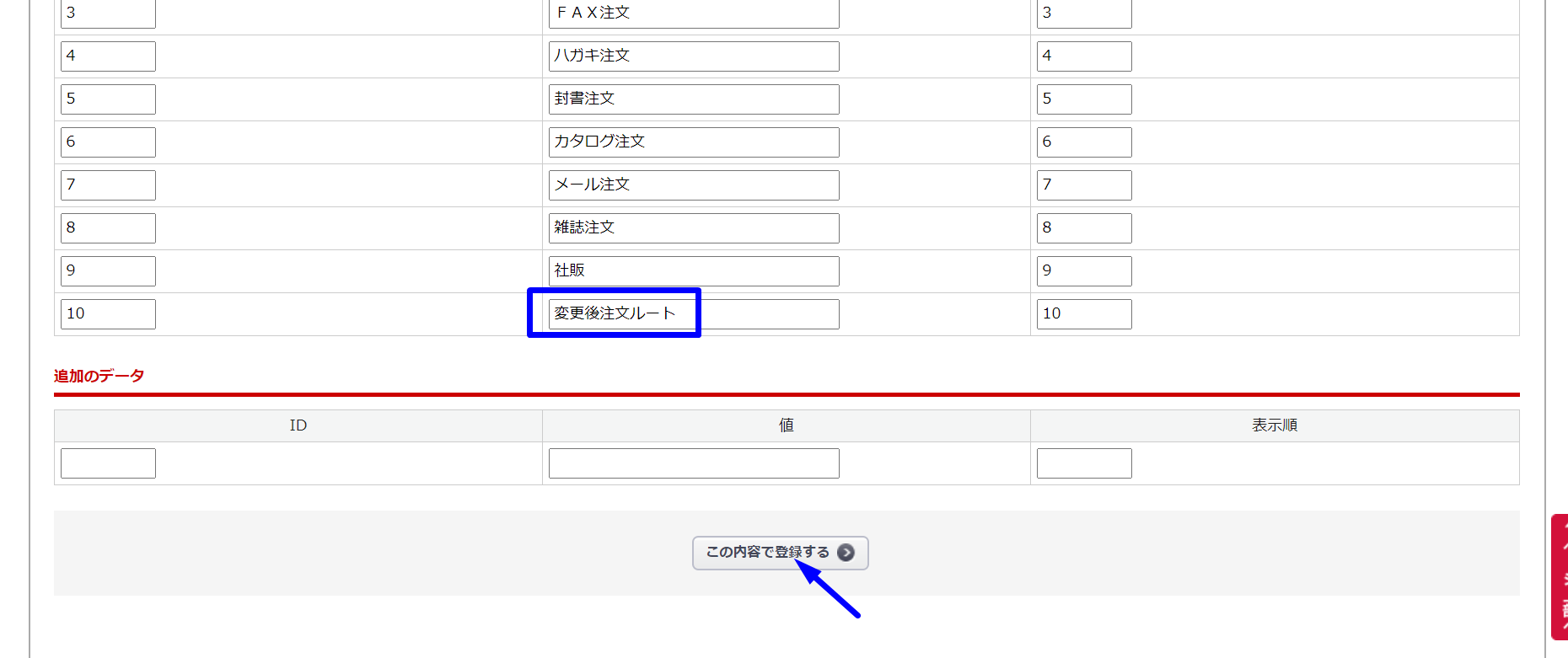 下部「追加のデータ」欄に新しく追加したい注文ルートを入力し、登録ボタンを押下してください。