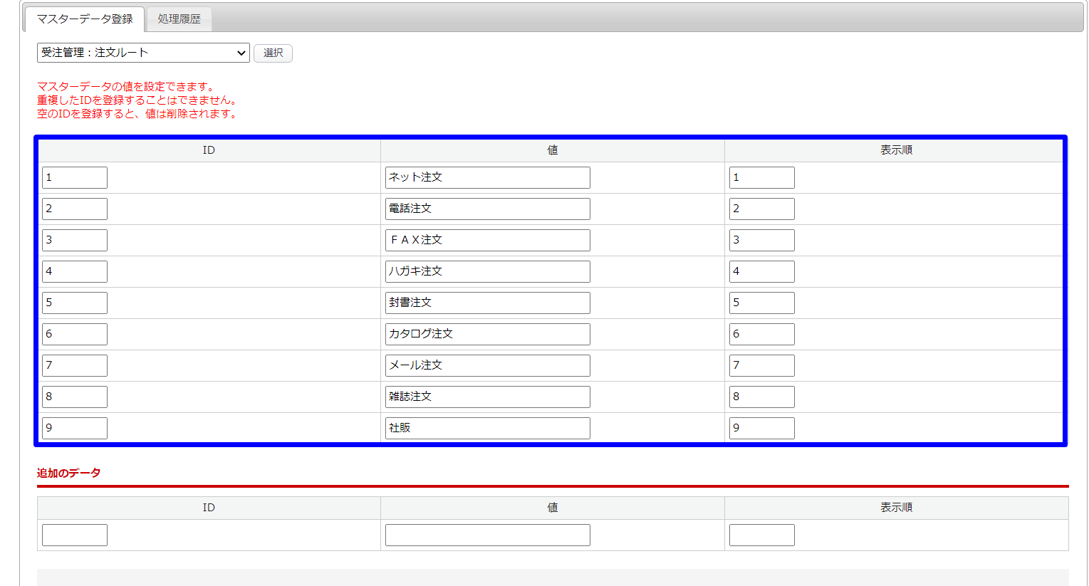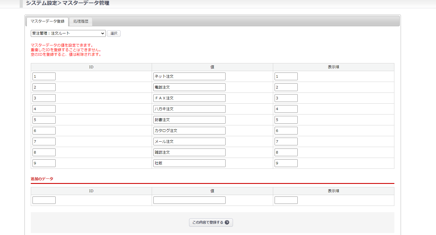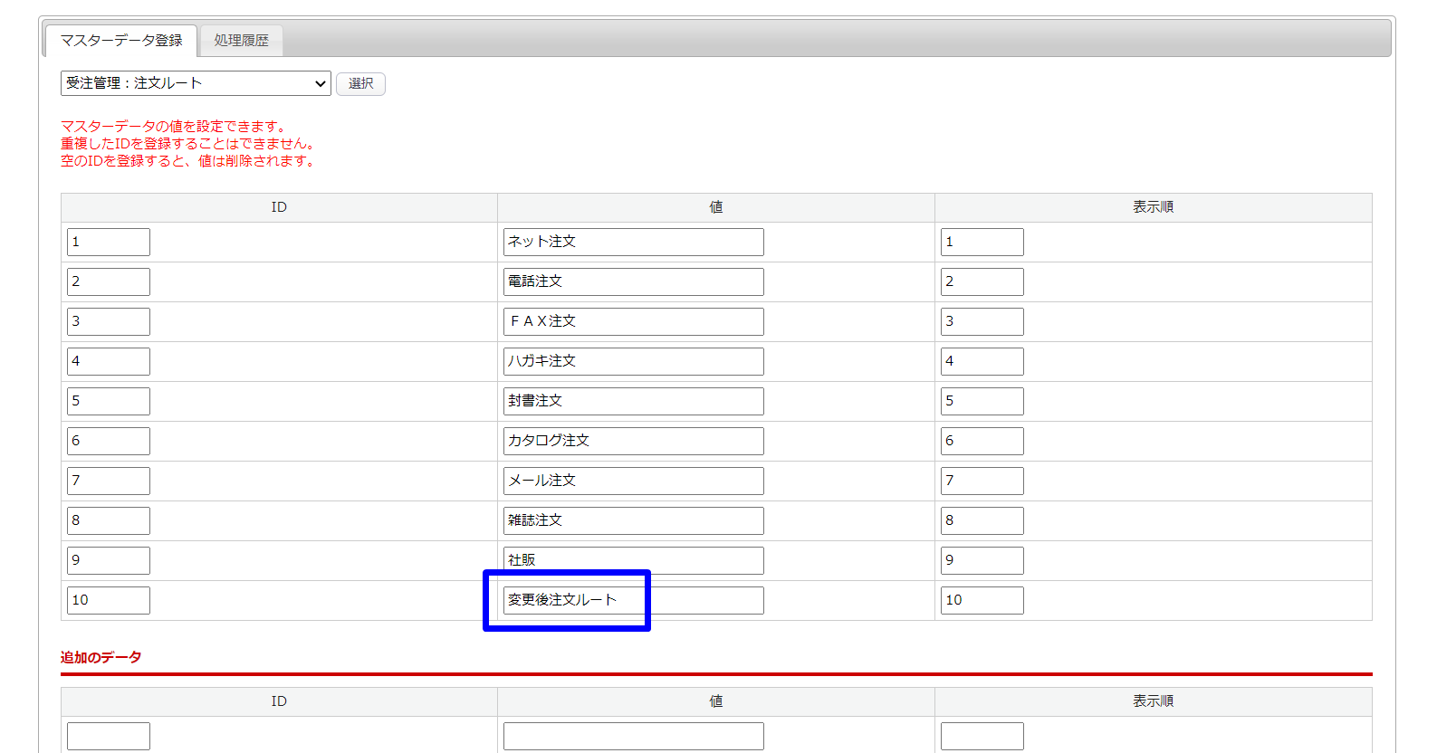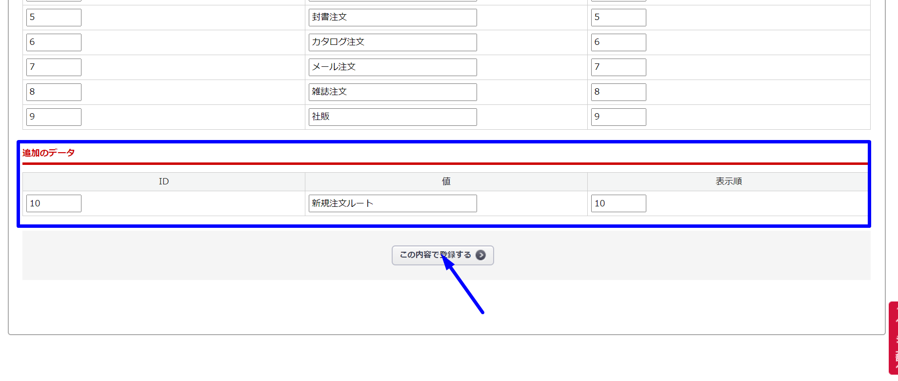 下部「追加のデータ」欄に新しく追加したい注文ルートを入力し、登録ボタンを押下してください。