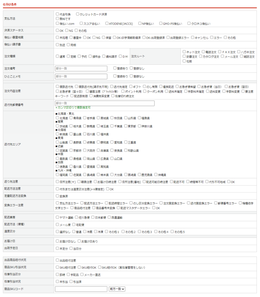 | 注文備考 | 対象となる注文備考(部分一致)を記入してください。 登録の有無を指定できます。 |