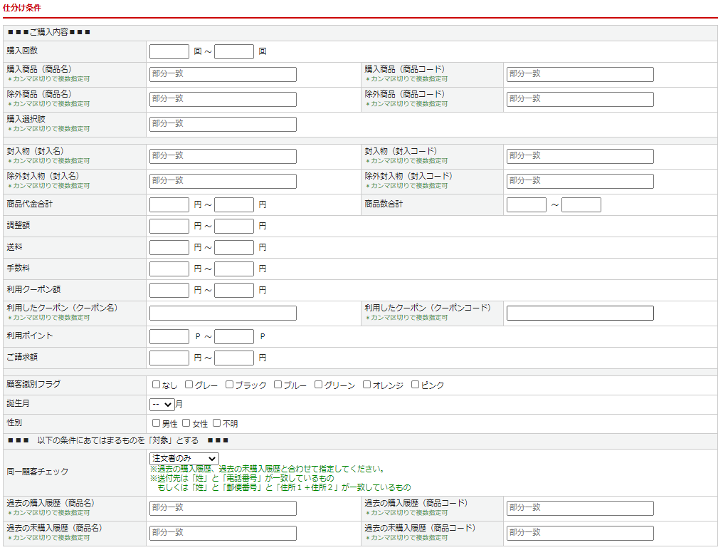 | 同一顧客チェック | 同一顧客チェックを行う対象を選択します。 過去の購入履歴、過去の未購入履歴と合わせて指定してください。 ※送付先は「姓」と「電話番号」が一致しているもの もしくは「姓」と「郵便番号」と「住所1+住所2」が一致しているもの |