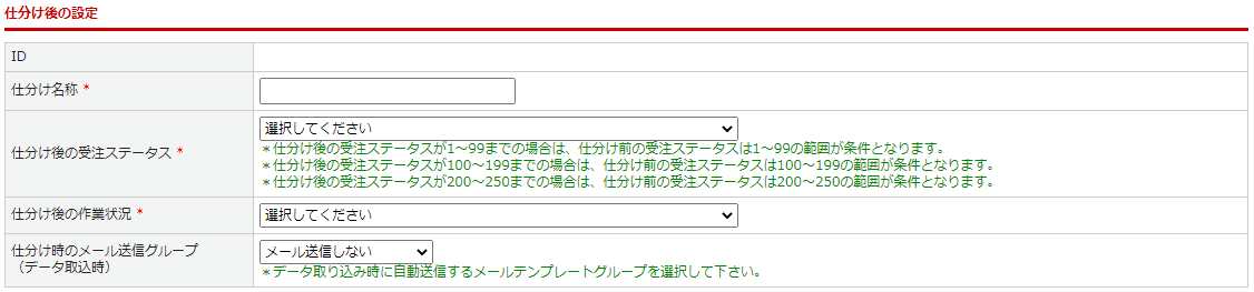 | 仕分け後の受注ステータス * | 仕分け条件に合致した場合の移動先受注ステータスを指定します。 |