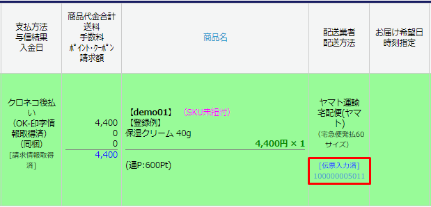 出荷伝票出力処理を実施後、受注一覧画面にてお荷物伝票番号が確認いただけます。