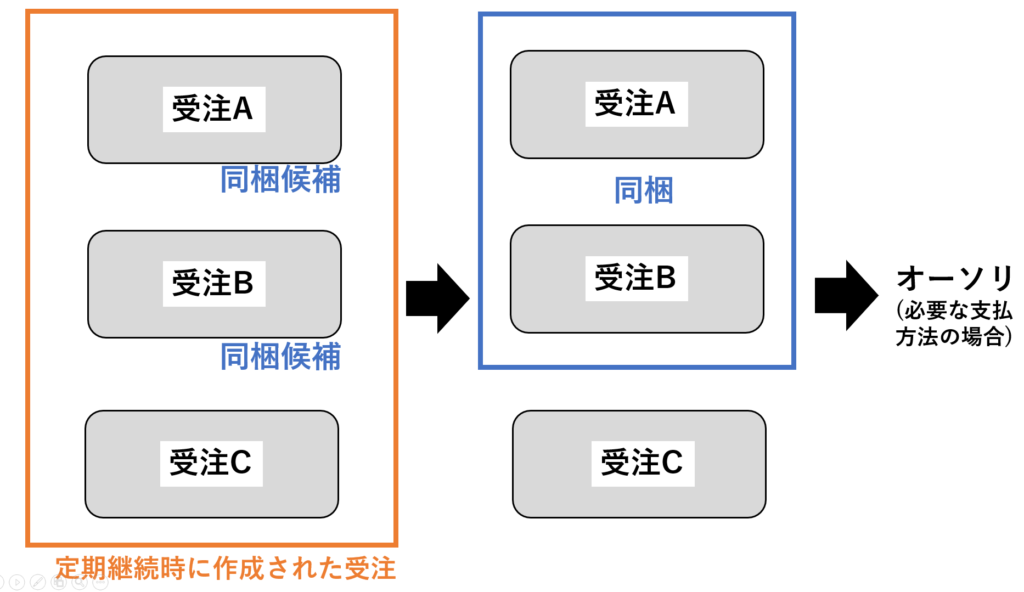 定期継続時に作成された受注データの中で同梱候補のものを自動で同梱する機能です。