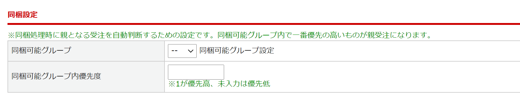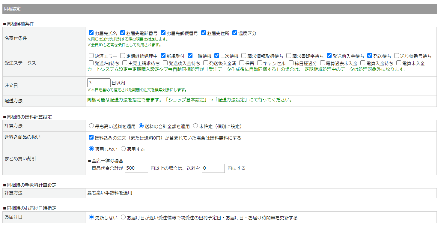基本設定>管理システム設定>名寄せ・同梱設定タブ内 「同梱設定」欄