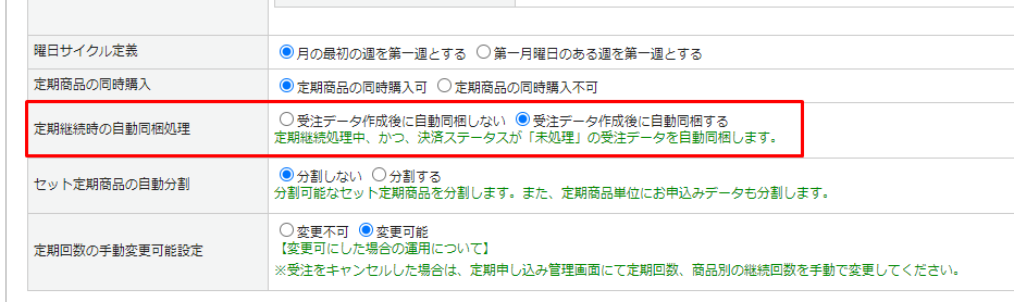 定期継続時の自動同梱処理を「受注データ作成後に自動同梱する」に設定してください。