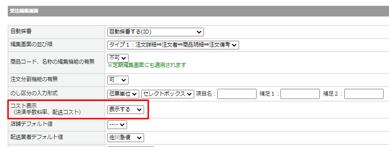 「コスト表示(決済手数料率、配送コスト)」を「表示する」に設定してください。