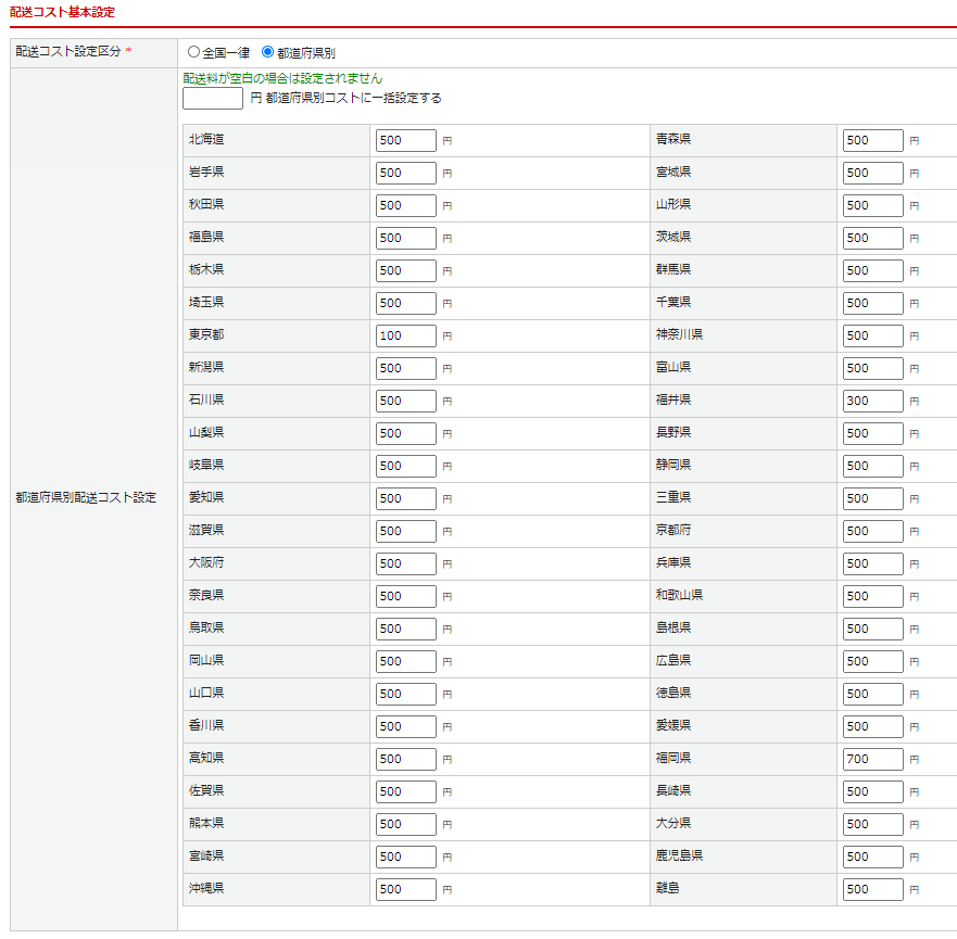 配送コスト設定区分と配送コスト設定のテキストボックスに金額を設定します。