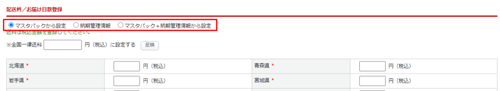 配送料/お届け日数登録にて、「マスタパックから設定」または「マスタパック+納期管理情報」を選択する必要があります。