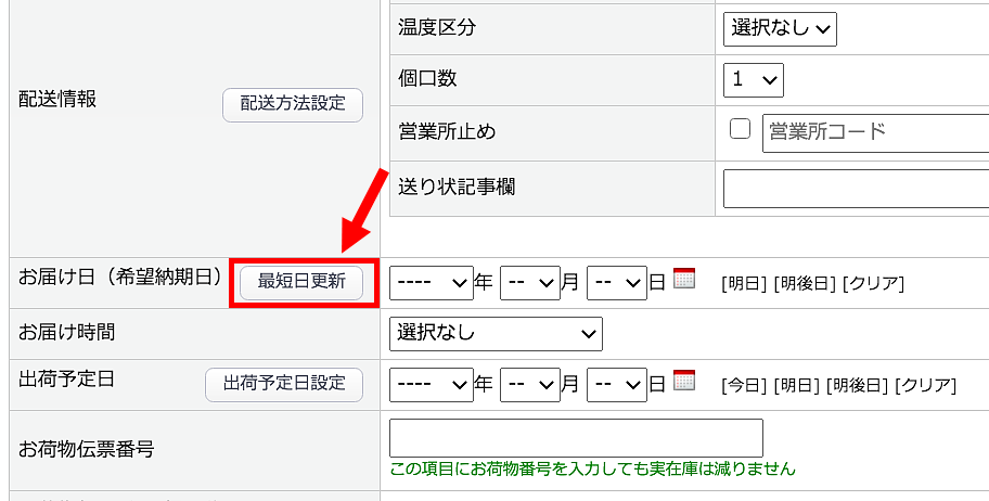 受注登録画面で「配送方法:ヤマト運輸」「送付先住所」「購入商品」を入力すると、「お届け日(希望納品日)」項目欄横に【最短日更新】ボタンが表示されます。