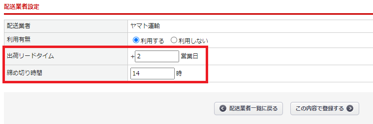 基本設定>配送業者設定 でヤマト運輸の「出荷リードタイム」と「締め切り時間」を設定します。