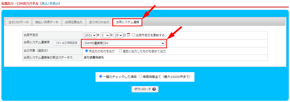 出荷システム連携用のプルダウンより「SWMS連携用CSV」を選択してCSVを出力します。