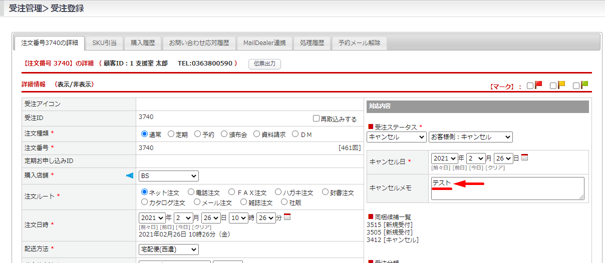 ※キャンセル理由は受注詳細の”キャンセルメモ”に表示されます。