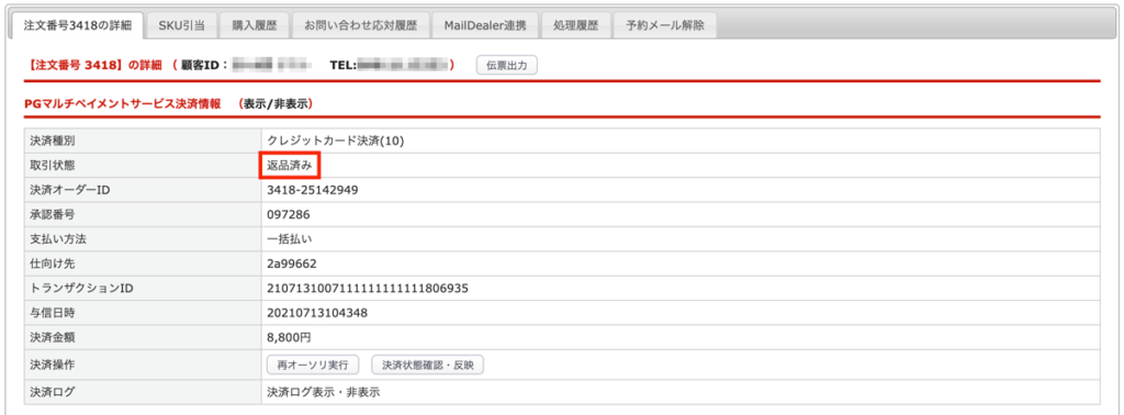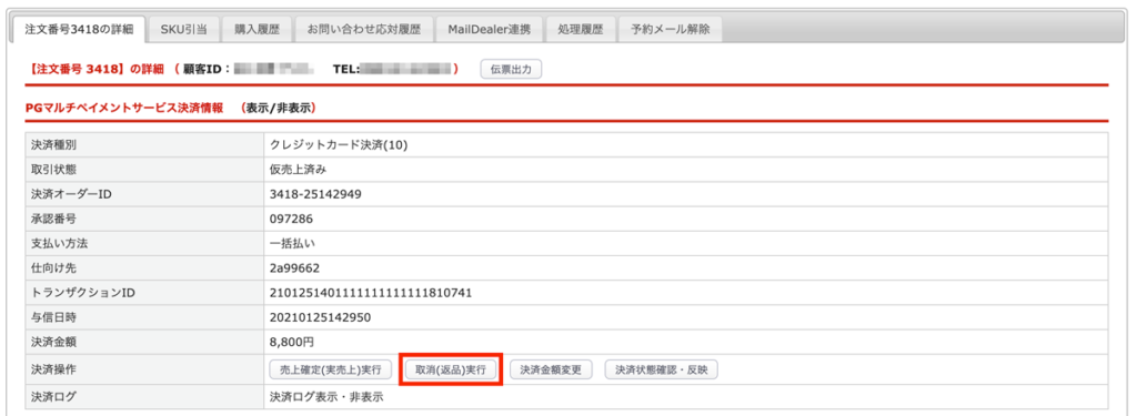 受注登録画面から決済取消を行い、受注ステータスを変更します。