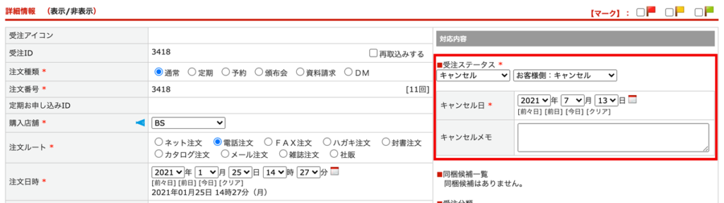 受注ステータスで[キャンセル]を選択し、キャンセル理由を選択してください。