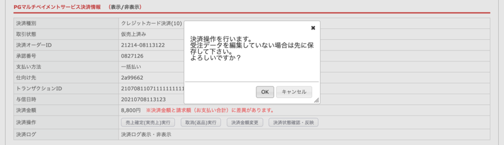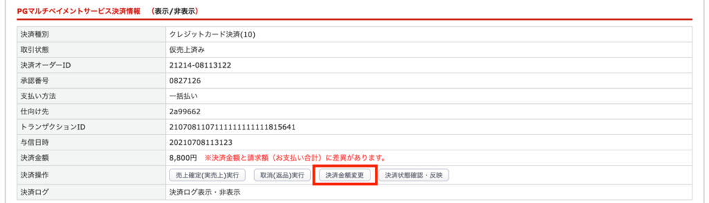 金額変更後、「※決済金額と請求額(お支払い合計)に差異があります。」と表示されます。