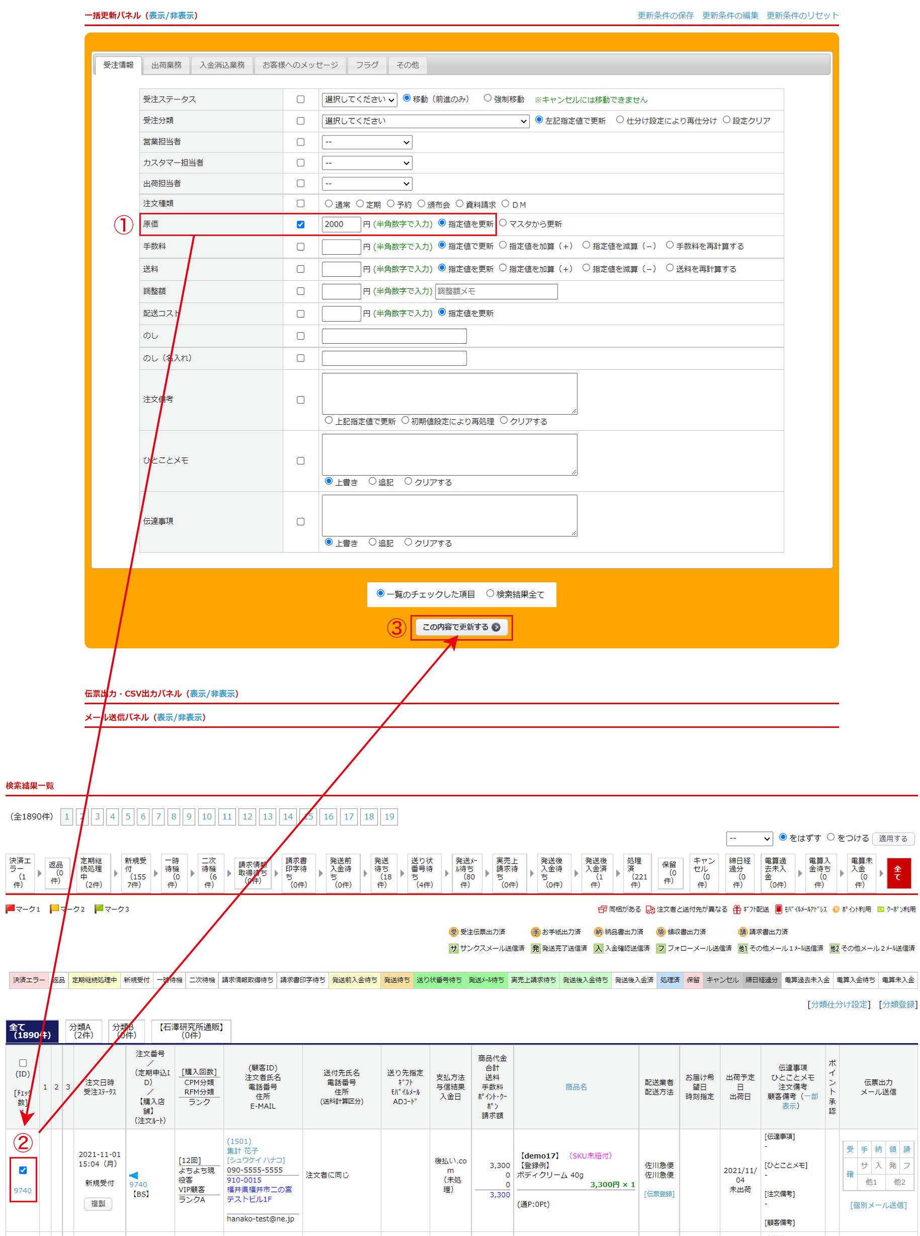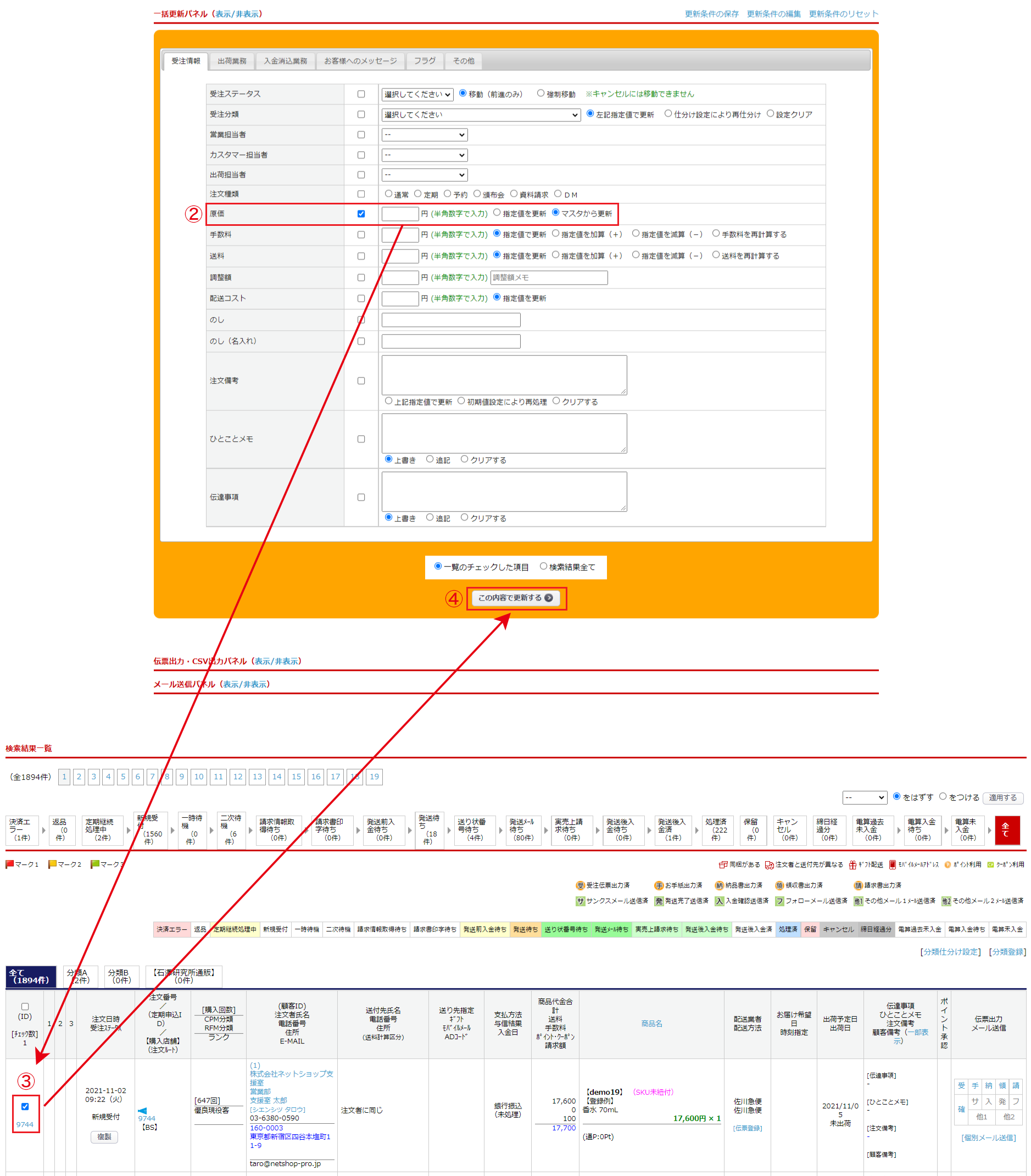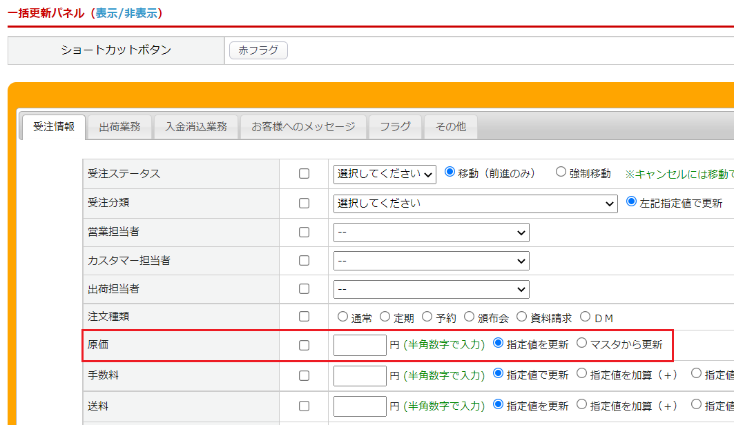 受注管理>受注一覧>一括更新パネル>「受注情報」タブ