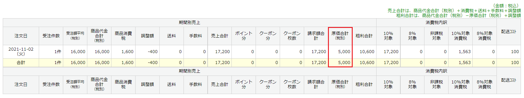 期間別集計の原価合計項目が「指定値を更新」で反映した新しい原価に更新されました。