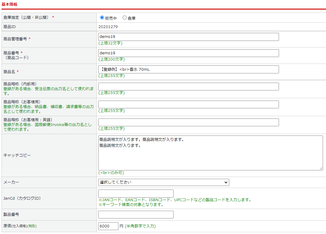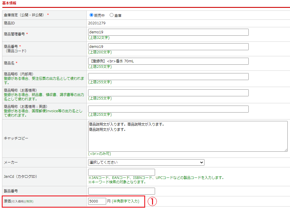 ① 出品管理>出品商品登録 基本情報項目「原価(仕入価格)(税別)」に原価をセットし登録します。