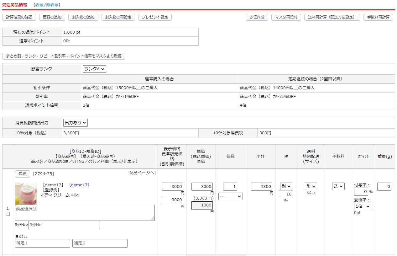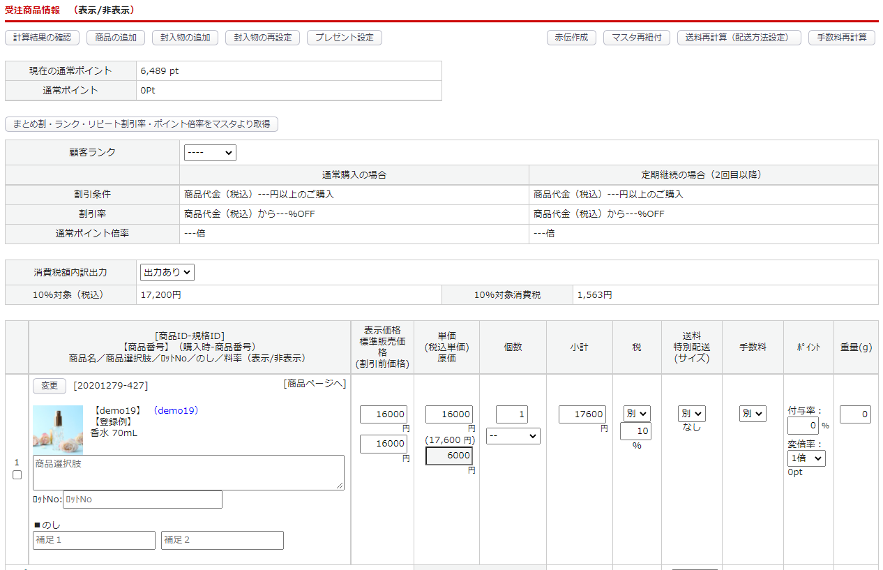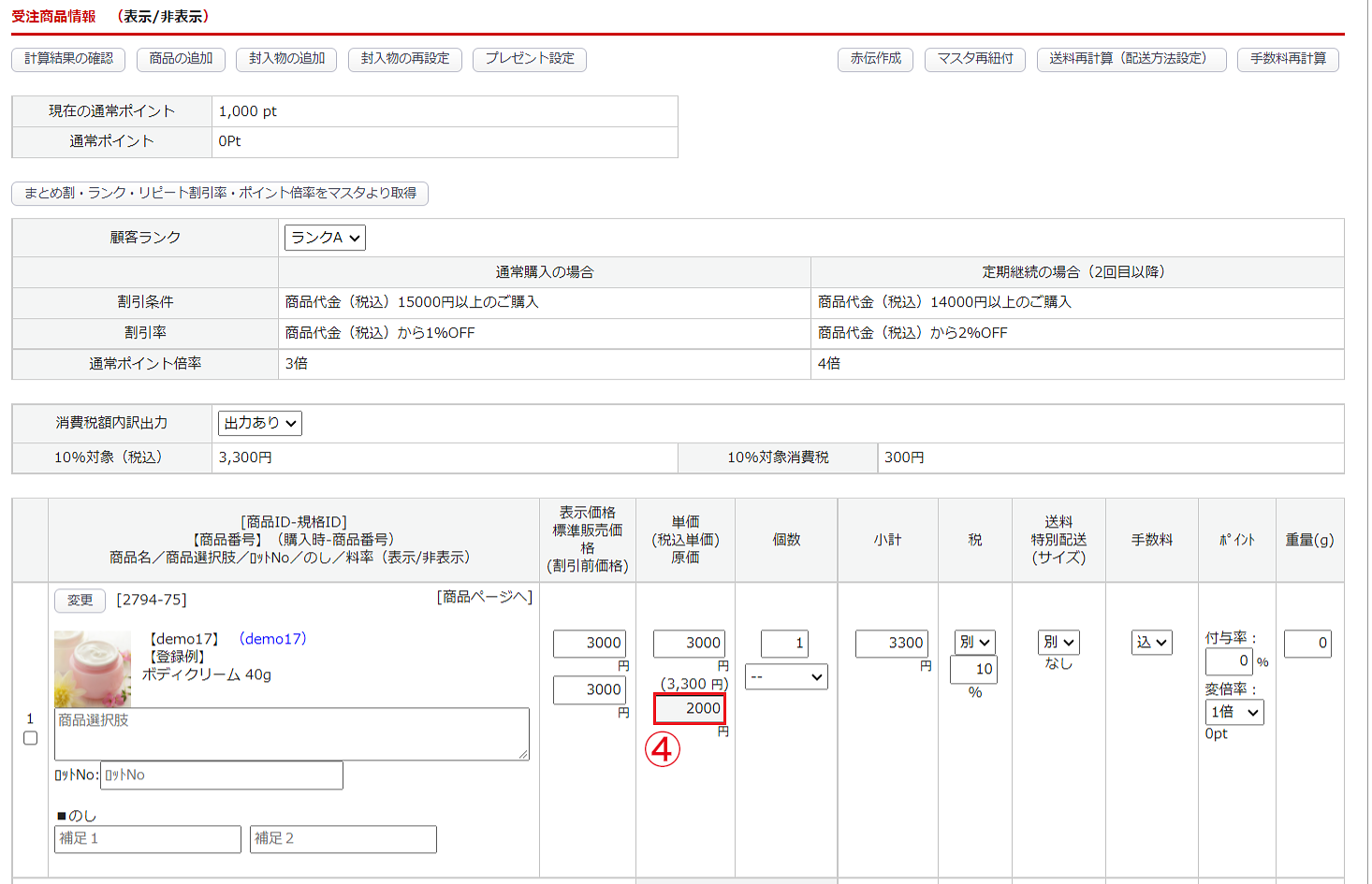 ④ 受注データ更新後、受注商品情報に新しい原価が更新されました。(下記画像④)