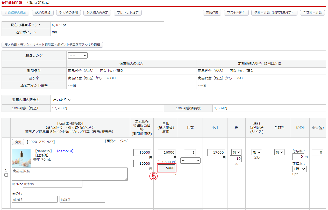⑤ 受注データ更新後、受注商品情報に新しい原価が更新されました。(下記画像⑤)