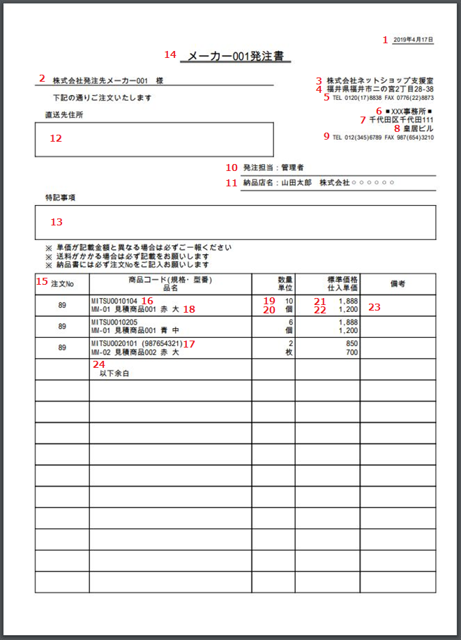 在庫登録のされている出品商品を出力した場合、発注書明細部の出力内容は出品>在庫(商品規格)登録の設定が出力されます。