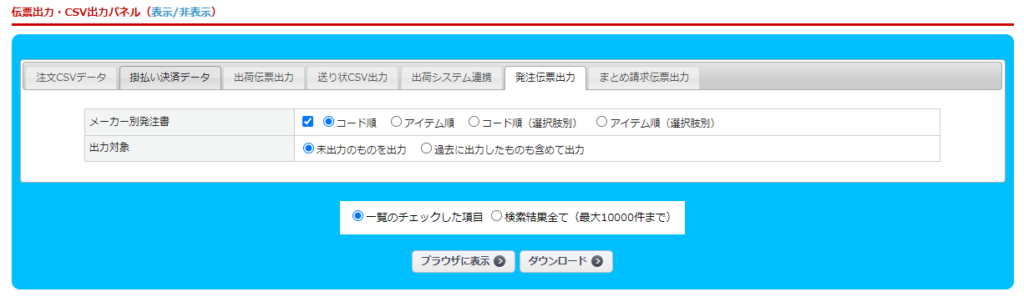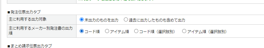 主に利用するメーカー別発注書の出力順 伝票出力・CSV出力パネル>発注伝票出力タブ>メーカー別発注書をデフォルト設定です。