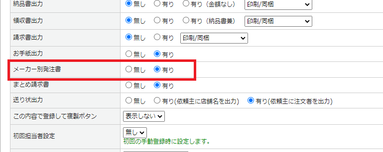 出力有無を「有り」にすることでフロントページから受注が作成された場合、受注詳細画面内「伝票出力オプション」の初期値が「有り」に設定されます。