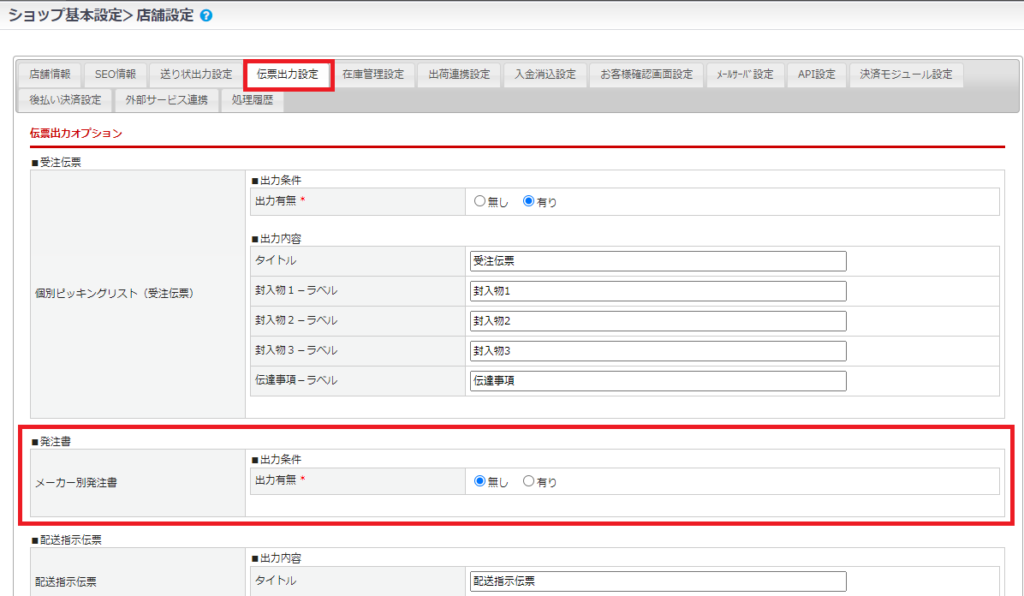 基本設定>店舗設定>「伝票出力設定」タブ>■発注書