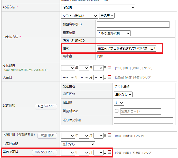 クロネコ後払いは取引登録時、出荷予定日が必須のため、管理システム設定で自動セットしないに設定していても出荷予定日が自動でセットされる仕様になっています。