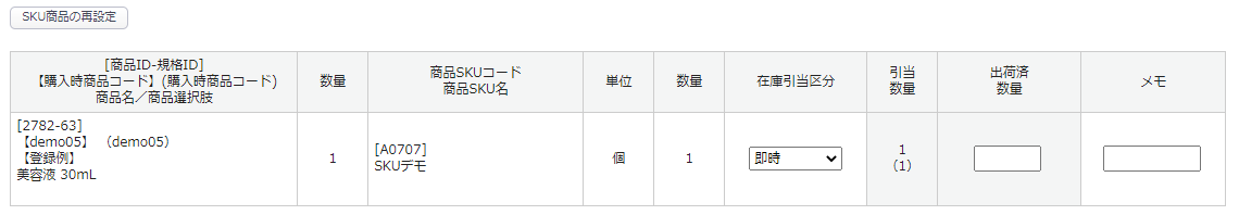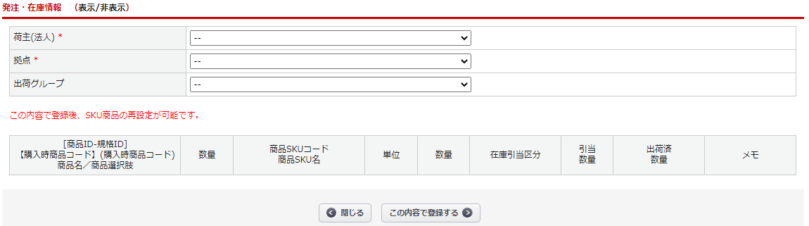 出品>出品商品登録の【在庫設定】ボタンより表示される 出品>出品商品登録 にて紐づけた出品単品SKU情報で再設定されます。