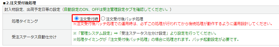 しかし、基本設定>管理システム設定>[業務フロー]タブ>注文受付後処理 の処理タイミングを[注文受付時]に設定しなければ、受注作成時に自動設定されません。