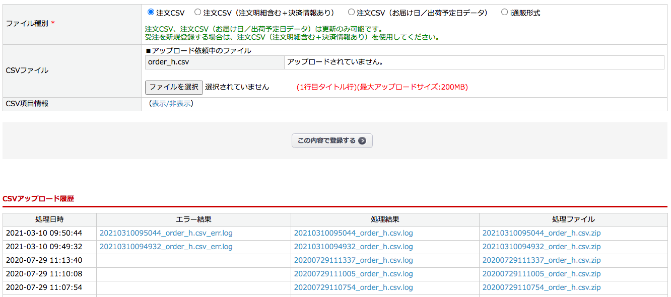 既に登録されている受注IDを指定したファイルをアップロードした際、対象の受注データにファイルの内容が上書きされます。