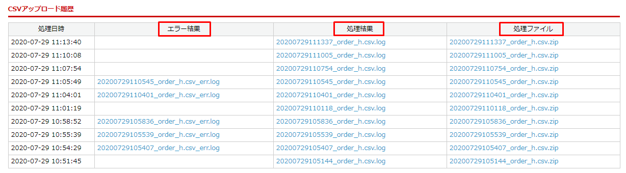各ファイル種別ごとに、アップロードしたCSVの履歴が表示されます。